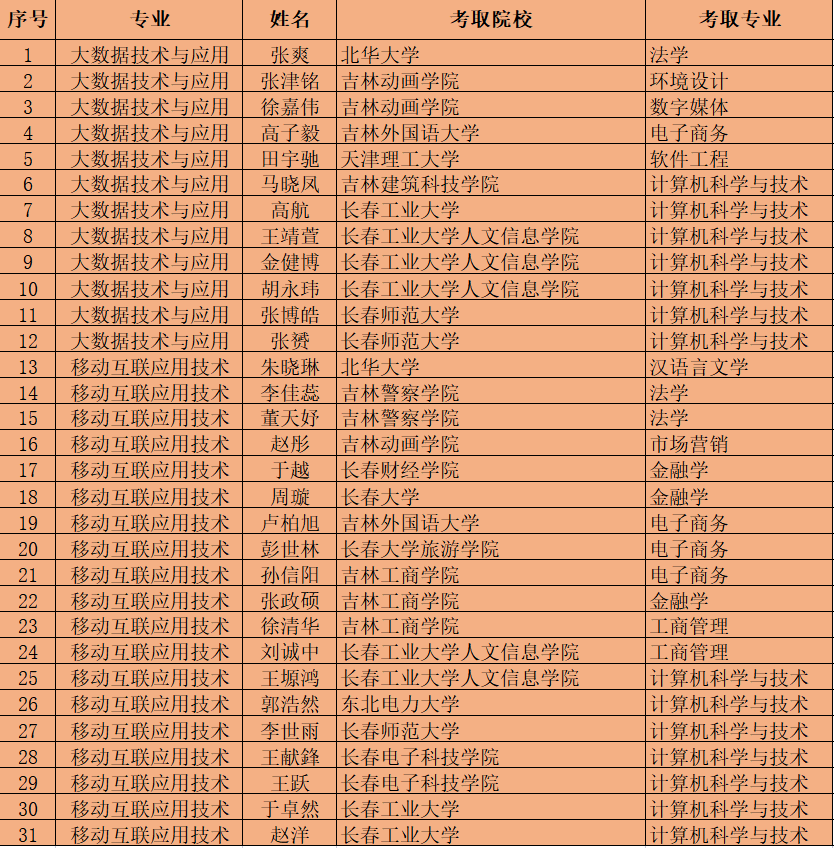 近日,2023年吉林省普通高校专升本教育考试录取结果已公布,开云kaiyun官方网站2023届专科毕业生(大数据技术与应用专业、移动互联应用技术专业)共计46名同学报考,其中31名同学分别被天津理工大学、东北电力大学、长春工业大学、长春大学、北华大学等高校录取。