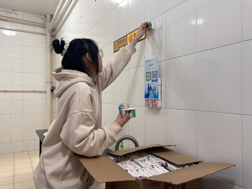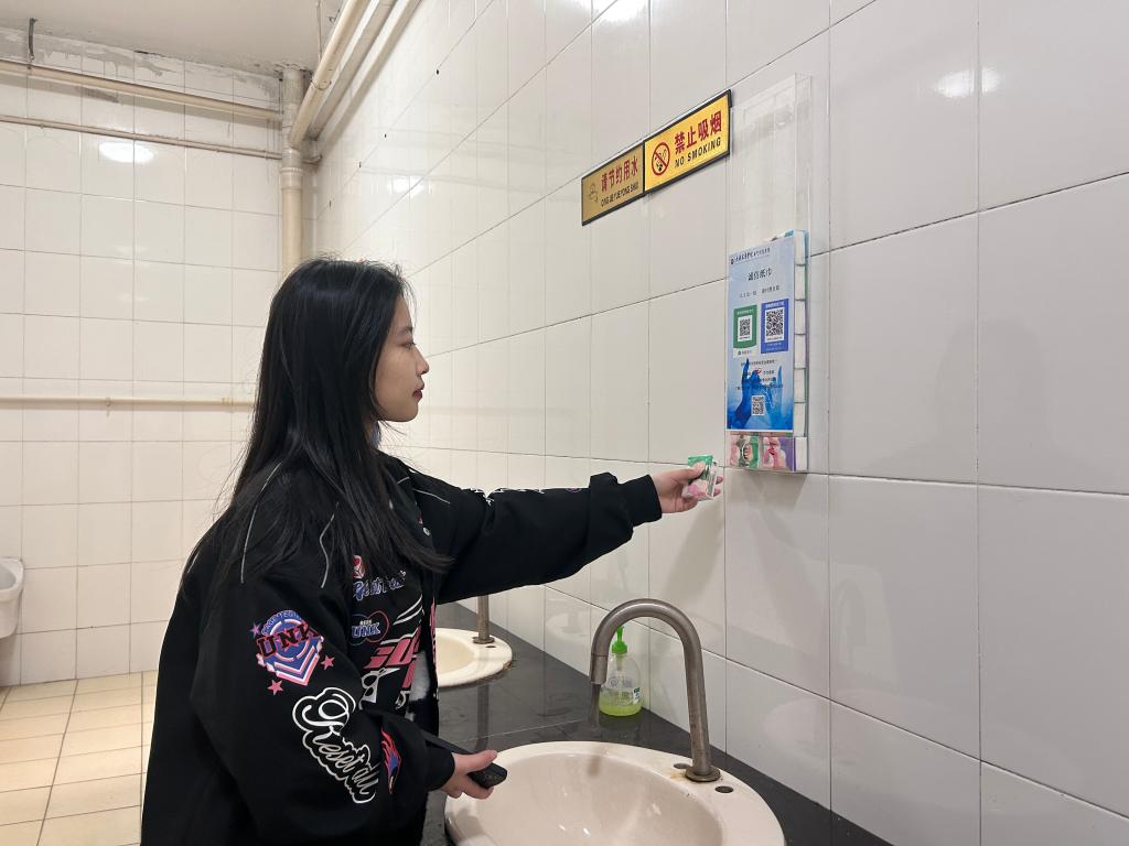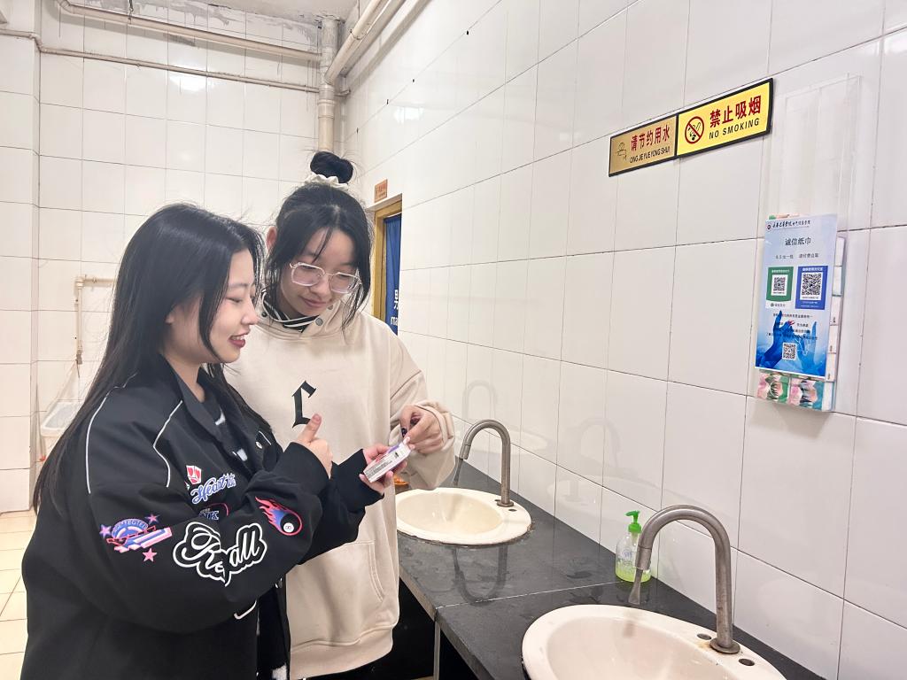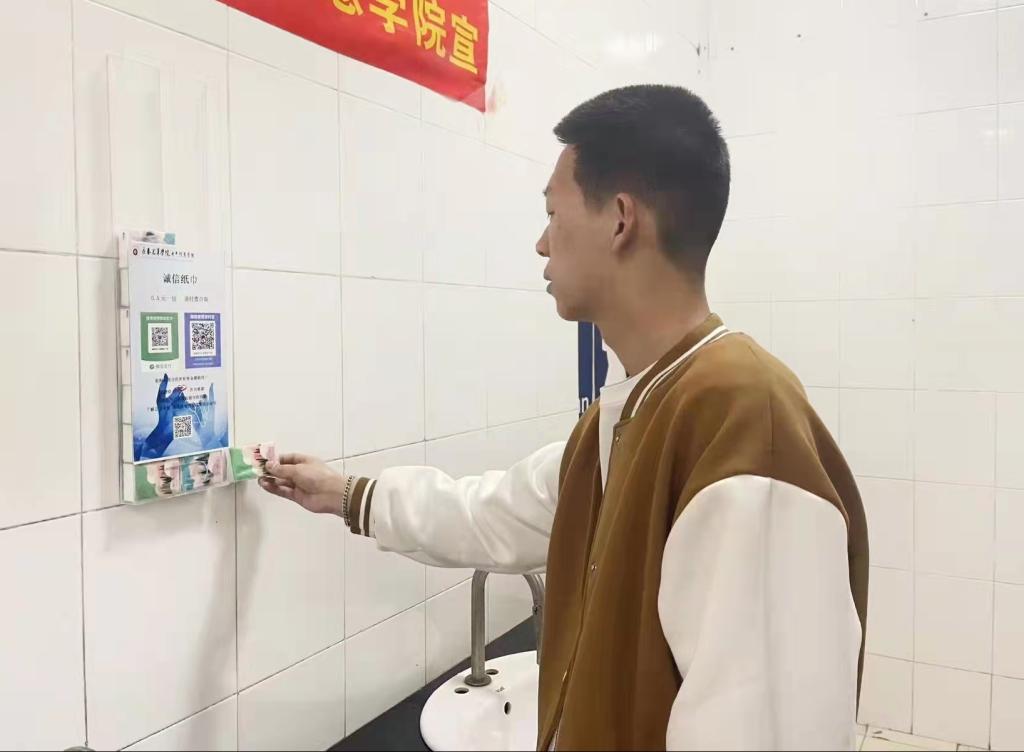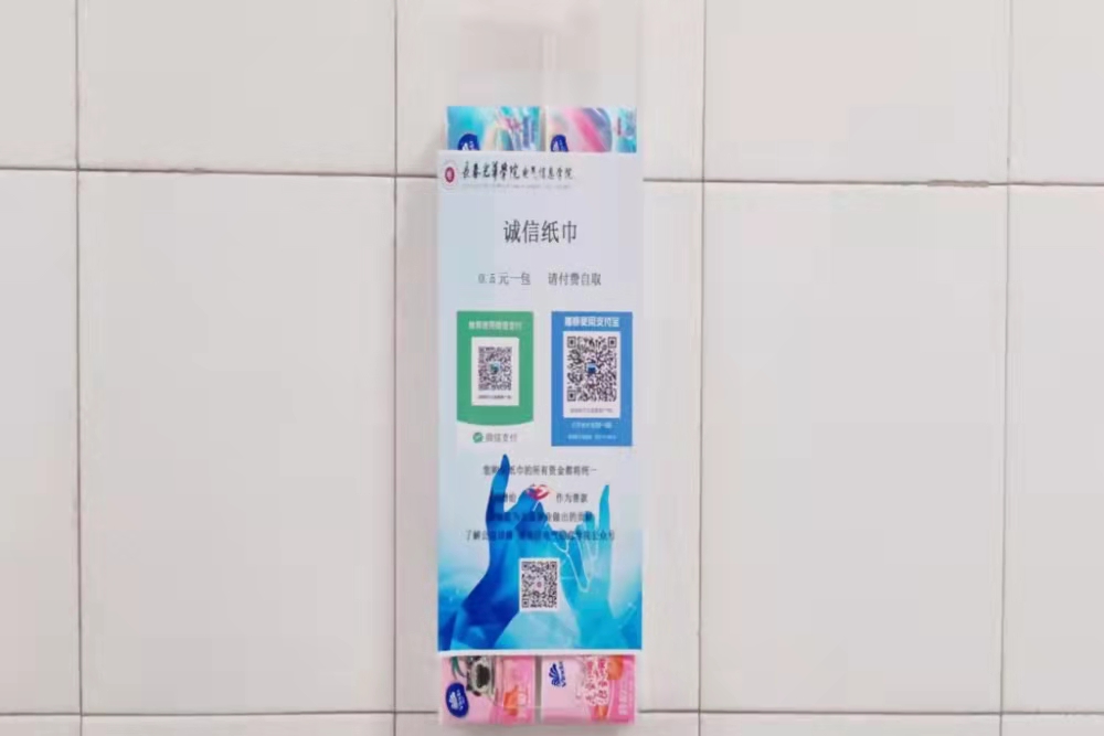 这些温暖的“小帮手”分别放置于第二教学楼一楼大厅和各个楼层卫生间洗手台的墙壁上,它们由亚克力板组成简易收纳盒,收纳盒内装有诚信纸巾,封面上印有“0.5元/包,请付费自取”字样,并配有支付宝和微信支付码标识,有需要的同学可自行扫码购买使用。