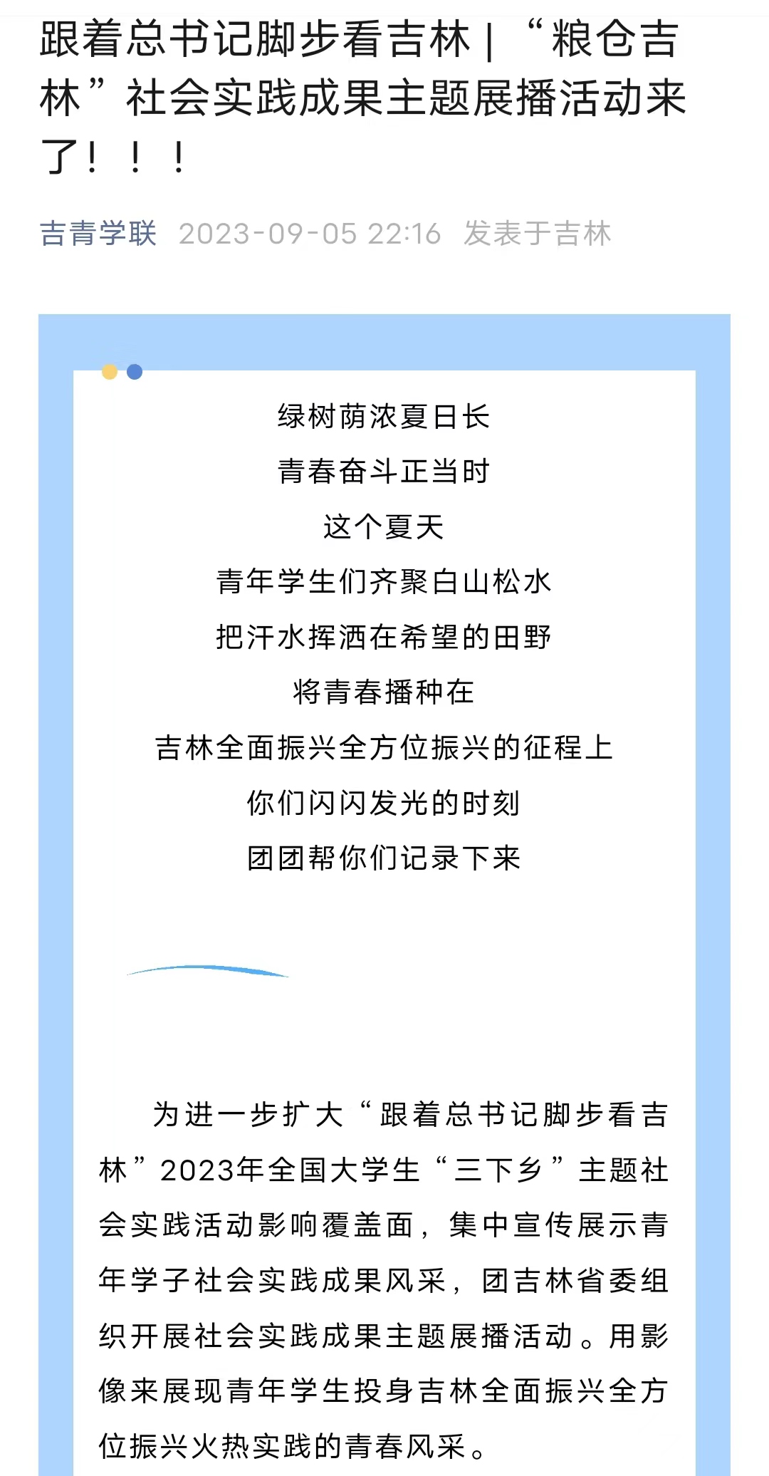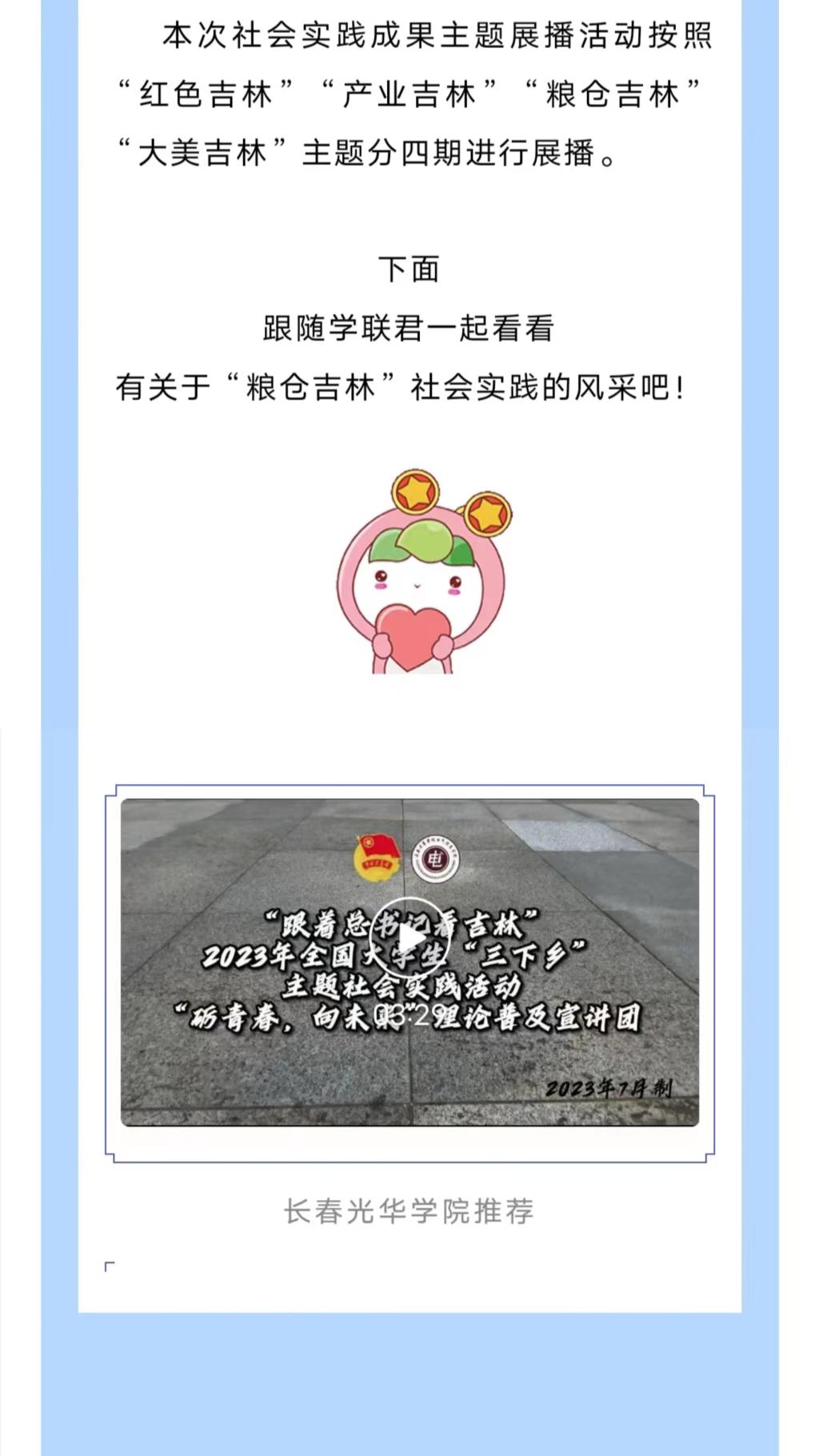 近日,吉青学联官微对“跟着总书记脚步看吉林”2023年全国大学生“三下乡”主题社会实践成果进行展播,其中展播出了开云kaiyun官方网站“砺青春,向未来”理论普及宣讲团暑期“三下乡”社会实践活动。