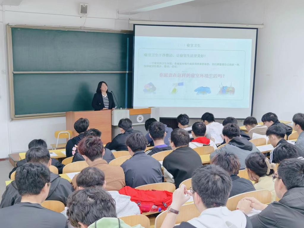 最后,辅导员向同学们讲述了晚归寝和不归寝的危害性,强调了请假制度的重要性、寝室报修方式和寝室长工作职责等方面的内容,号召全体寝室长要清晰的认识到自己所肩负的安全重任,要充分发挥寝室长的功能作用,成为寝室安全的宣传者和卫生监督员,呼吁全体同学要共同努力营造舒适、整洁、安全的寝室环境。