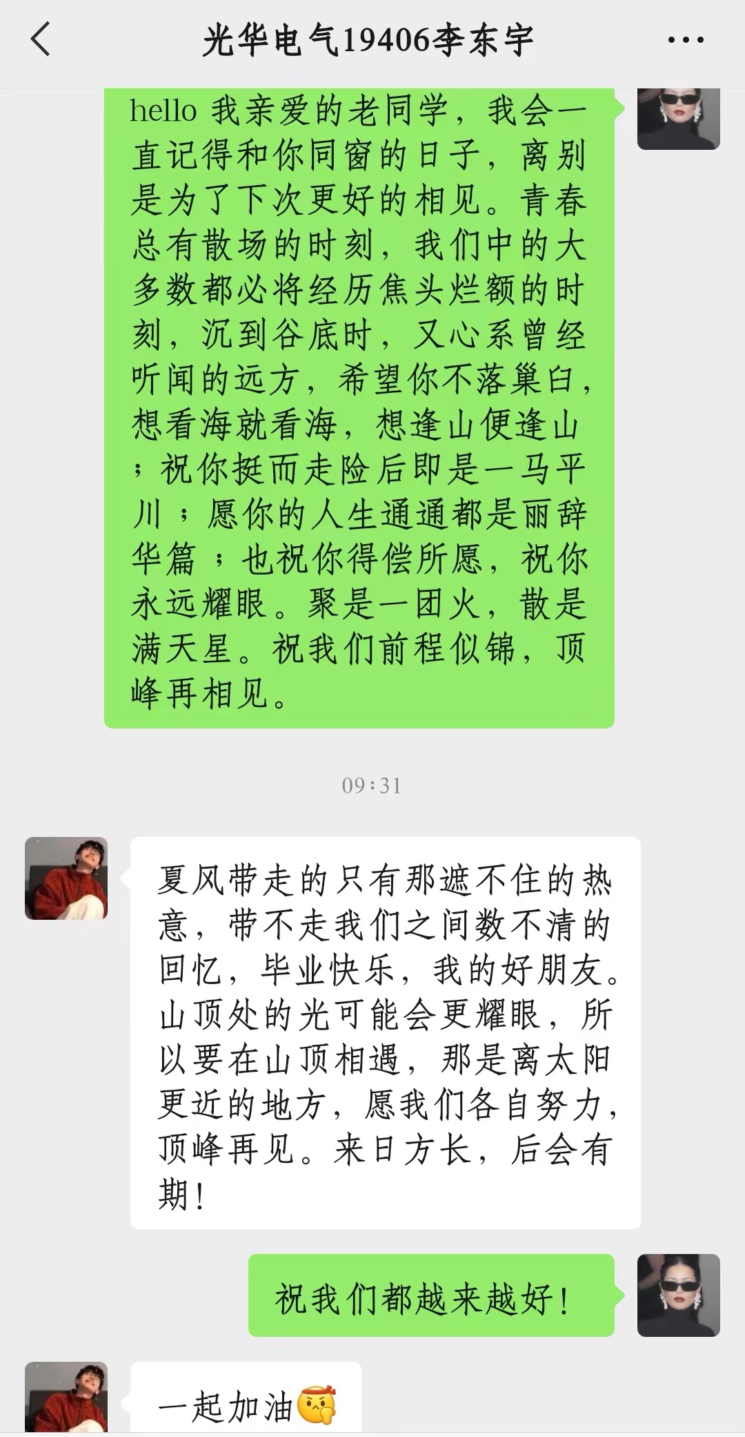Hello,我亲爱的老同学,我们会一直记得和你们同窗的日子,离别是为了下次更好的相见。聚是一团火,散是满天星。青春总有散场的时刻,祝你们得偿所愿,祝你们永远耀眼!祝我们大家前程似锦,毕业快乐!