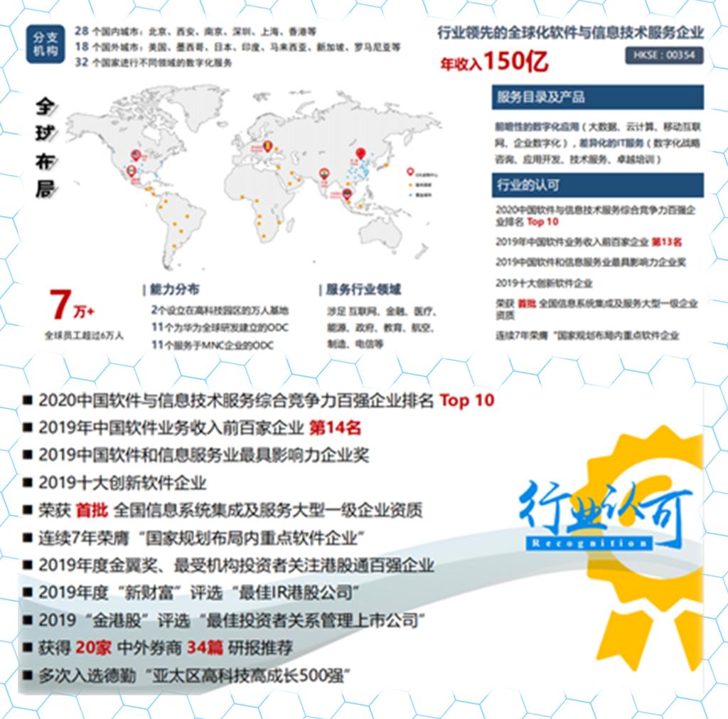中软国际有限公司是中国领先的大型综合性软件与信息服务企业,成立于2000年其20余年的发展历程,始终站在行业技术和业务变军革的前沿位置,深刻理解不断变化的产业用人需求,坚持以提升从业人员的职业技能为己任,与全国千余所高校开展合作。在北京、广州、天津、重庆、西安、厦门等10多个城市建立了近20个人才培养基地,形成了年培养学生8万人次的规模这些学生绝大部分最终进入到包括中软国际在内的行业各企事业用人单位就业。全球权威IT研究与顾问咨询机构Gartner发布了最新《2021IT服务市场份额排名》,中软国际与华为、阿里、中国移动、腾讯、中国电信、中国联通7家中国企业再次一同跻身全球IT服务供应商市场份额TOP100。